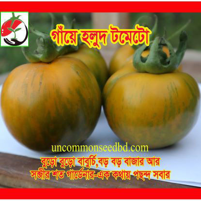 আজ টমেটোর ‘গাঁয়ে-হলুদ’ । জন্ম থেকে গাঁয়ের রং লেবু-সবুজ । দিন হিসেবে বয়স কুড়ি (৩ বার ) পার হবার পর থেকে গাঁয়ে আকর্ষনীয় ডোরা ডোরা জোড়া জোড়া সবুজাভ ছাপ পরিস্ফুটিত হতে থাকে । আরও প্রায় পক্ষকালে পা দিলে পরিপক্ক লেবু-সবুজ ত্বকে হলুদের রংচ্ছটা পূর্ণতা পায় । অর্থাৎ অন্যান্য সকল পরিনিতা টমেটোর ন্যায় গাঁয়ে লাল আলতা না জড়িয়ে বরং বৃতি বাহিত গড়ানো , হলুদে মাখা মাখা রঙে আচ্ছাদিত হয় । দেখে মনে হয়-এ যেন হঠাৎ ‘গাঁয়ে-হলুদ’ । দেখতে পরমা সুন্দরী-স্বাদে ষোড়শী । গড় ওজন প্রায় ১০০ গ্রাম । চমৎকার ফলন । শাঁস উজ্জ্বল সবুজ ।